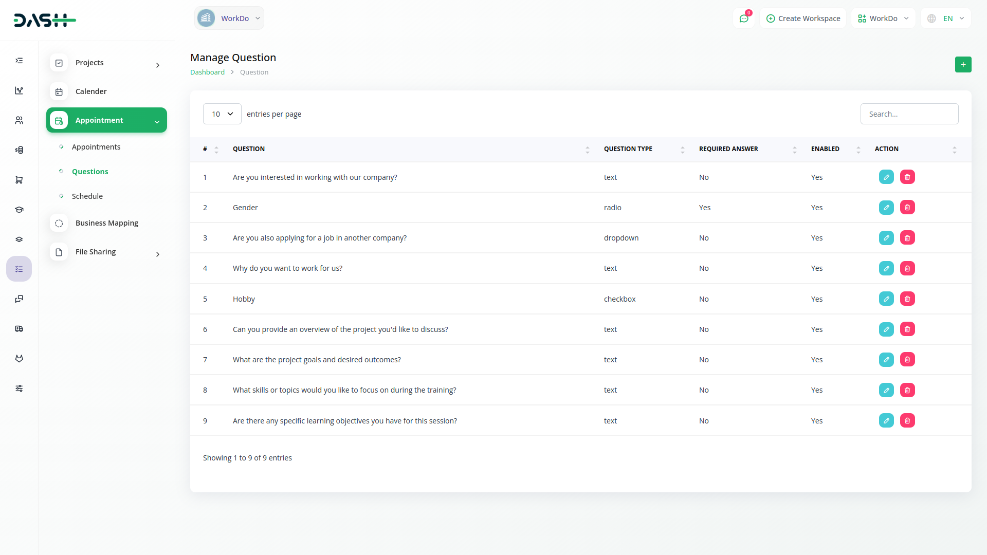 You just need to select a field and the appropriate type from the list. There are four field types available: Text, Radio, Dropdown and Checkbox You will be able to show the question without any extra effort. And you can decide whether to make that question mandatory or not. And you can also decide whether you want to keep that question in the appointment section or not.