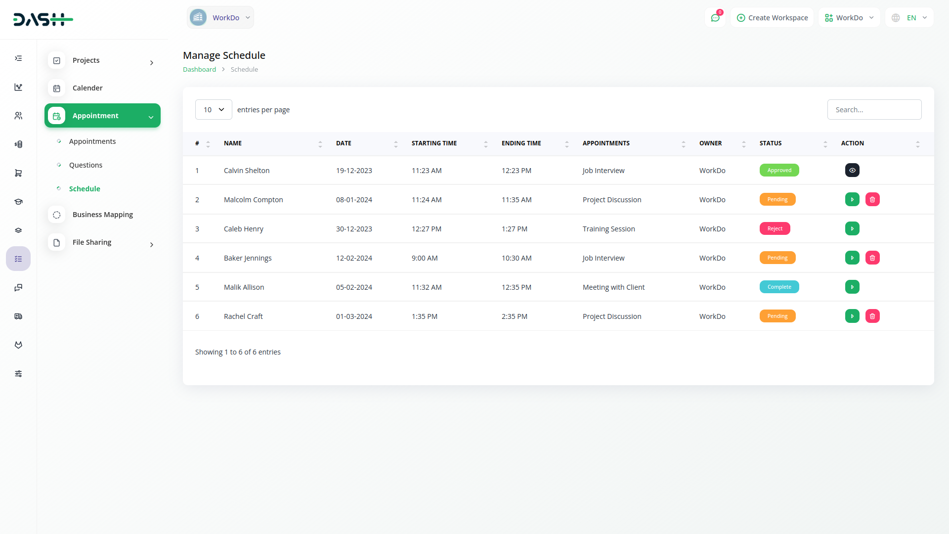 In the schedule section, the details of the filled appointment form are shown. In it, the schedule status action can be changed. It has the option to approve appointments, reject appointments, assign users, complete appointments, and send feedback forms after completion. Here, appointment approval or rejection will be communicated to the appointee through their email when they fill out the form, and a feedback form will also be sent.
