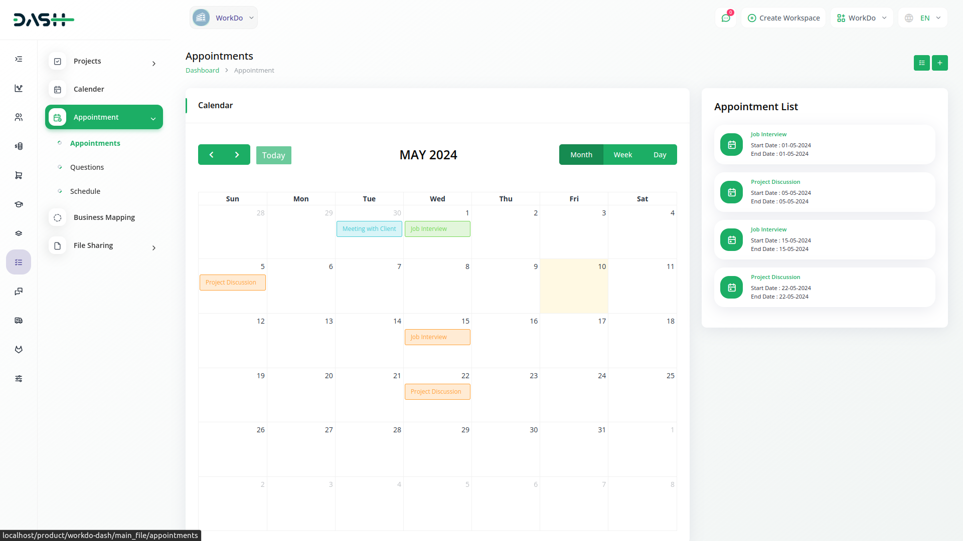In the appointment section, you can create an appointment. It has a calendar button that displays all appointments and changes color according to the appointment status. It has a copy link button, in which any user can fill out the appointment form.