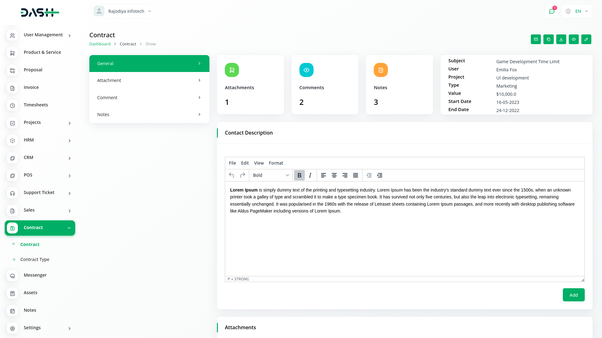 Contract Module is very helpful for proper documentation of the contracts done with clients showing the type of contract, the value, and time duration. The predefined settings can be done/ updated through Setup.