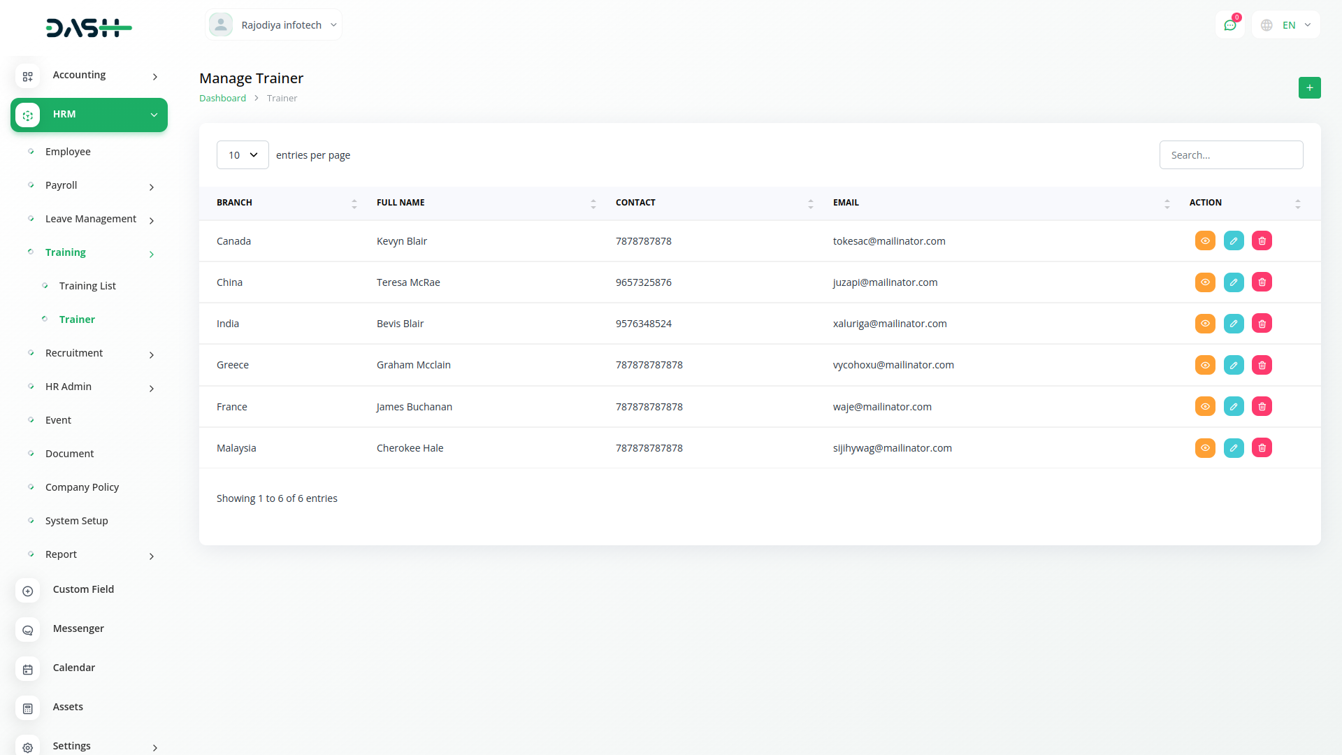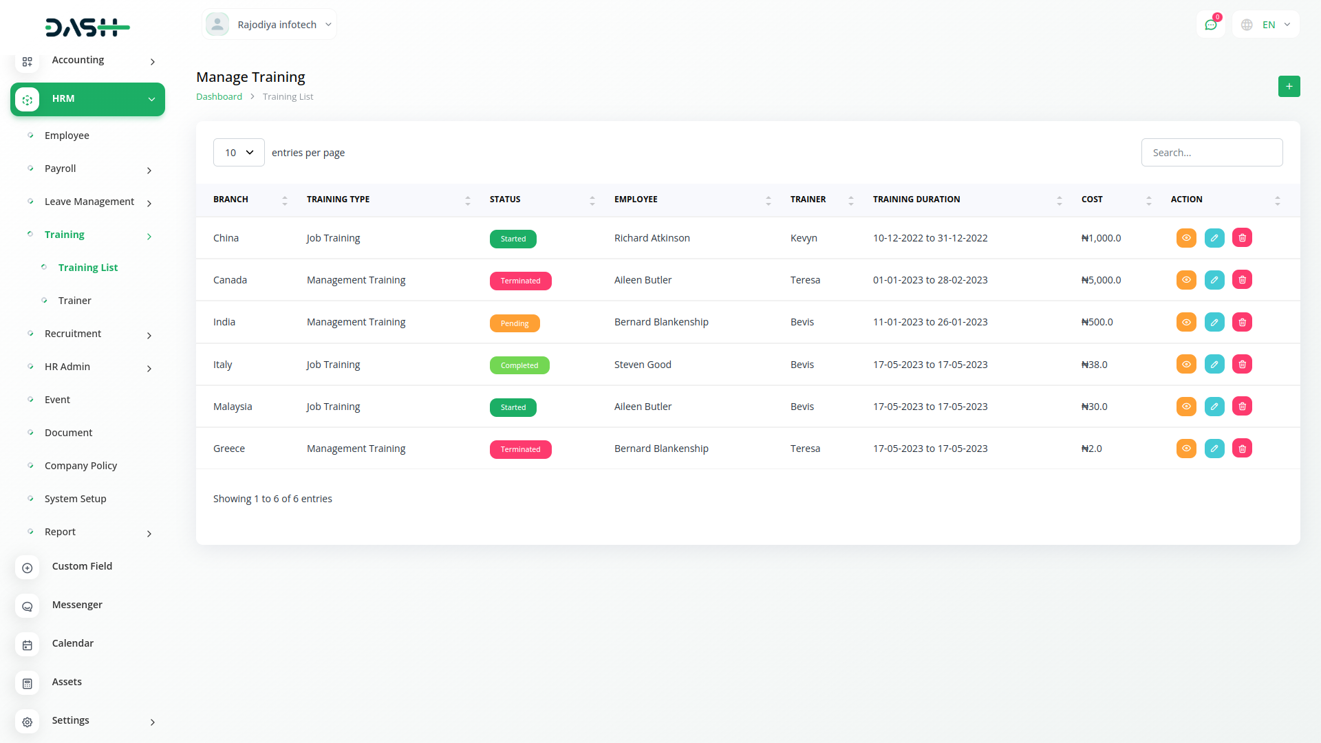 Employee training is quintessential in modern organizations. You can keep a tab on training activities by assigning a cost, duration, training, and training mode for each employee. Keep the list of your trainers handy through the easy listing.